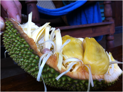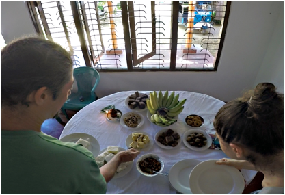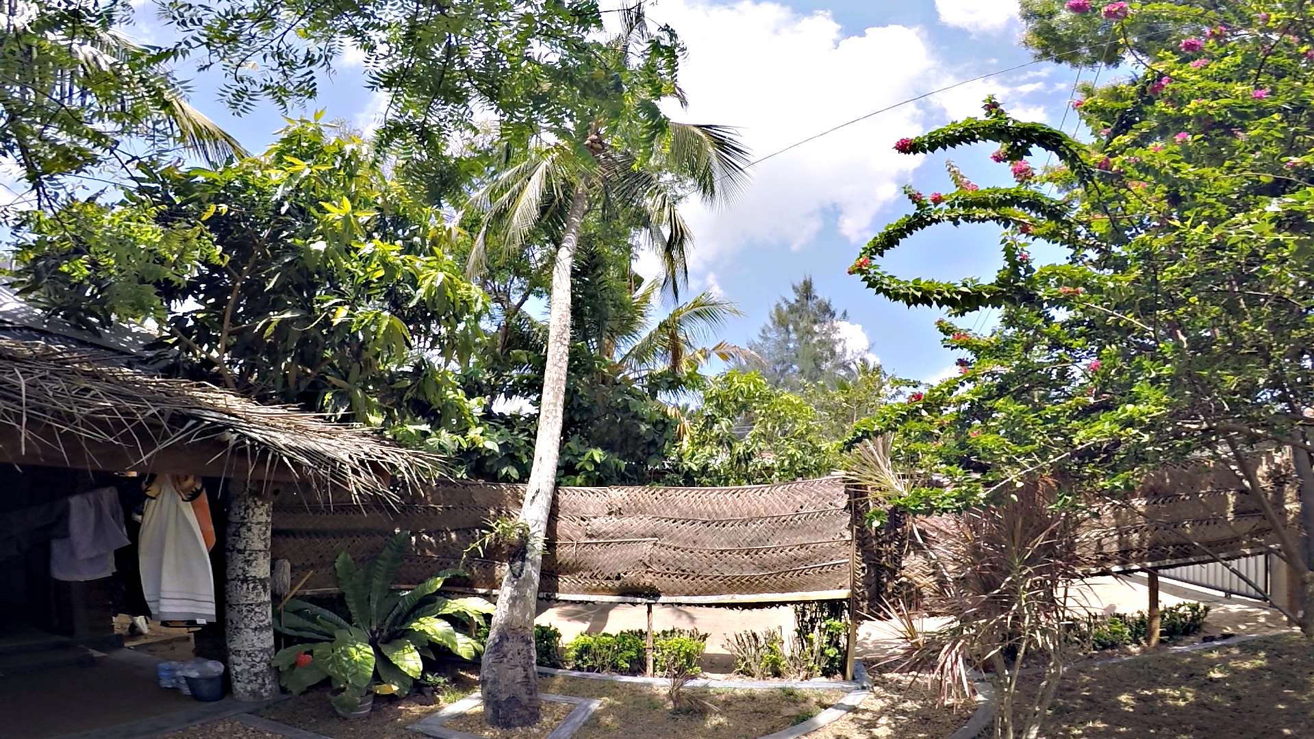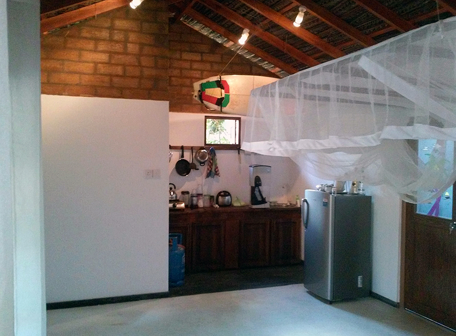 Das Gebäude mit Restaurant und Küche befindet sich auf dem Grundstück am Flußufer. Hier verarbeiten Gärtnerteam und Küche die Ernte aus dem halbhektargroßen Grundstück mit über 100 Kokospalmen, Obst- und Gewürzbäumen sowie einem 200-Quadratmeter-Gemüsegarten.